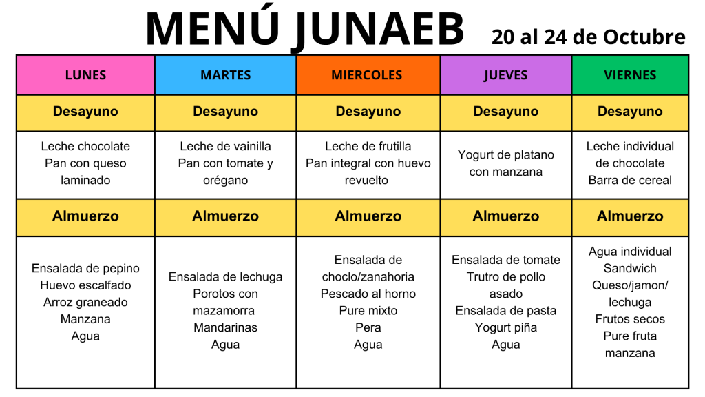 Menú JUNAEB semana del 20 al 24 de octubre