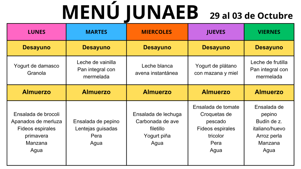 Menú JUNAEB semana del 29 al 03 de Octubre